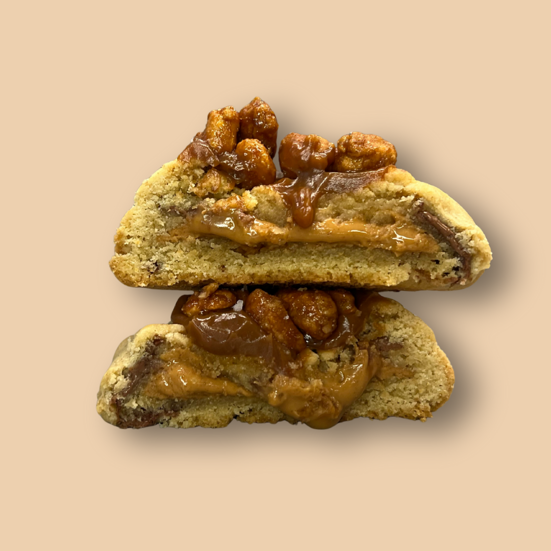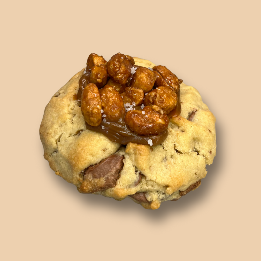 Farine de BLÉ, BEURRE, sucre blanc, cassonade, sucre muscovado, ŒUFS, bicarbonate de sodium, levure chimique, sel, chocolat au LAIT, CACAHUÈTES caramélisées, caramel (BEURRE, CRÈME, SULFITES), fleur de sel, beurre de CACAHUÈTE.