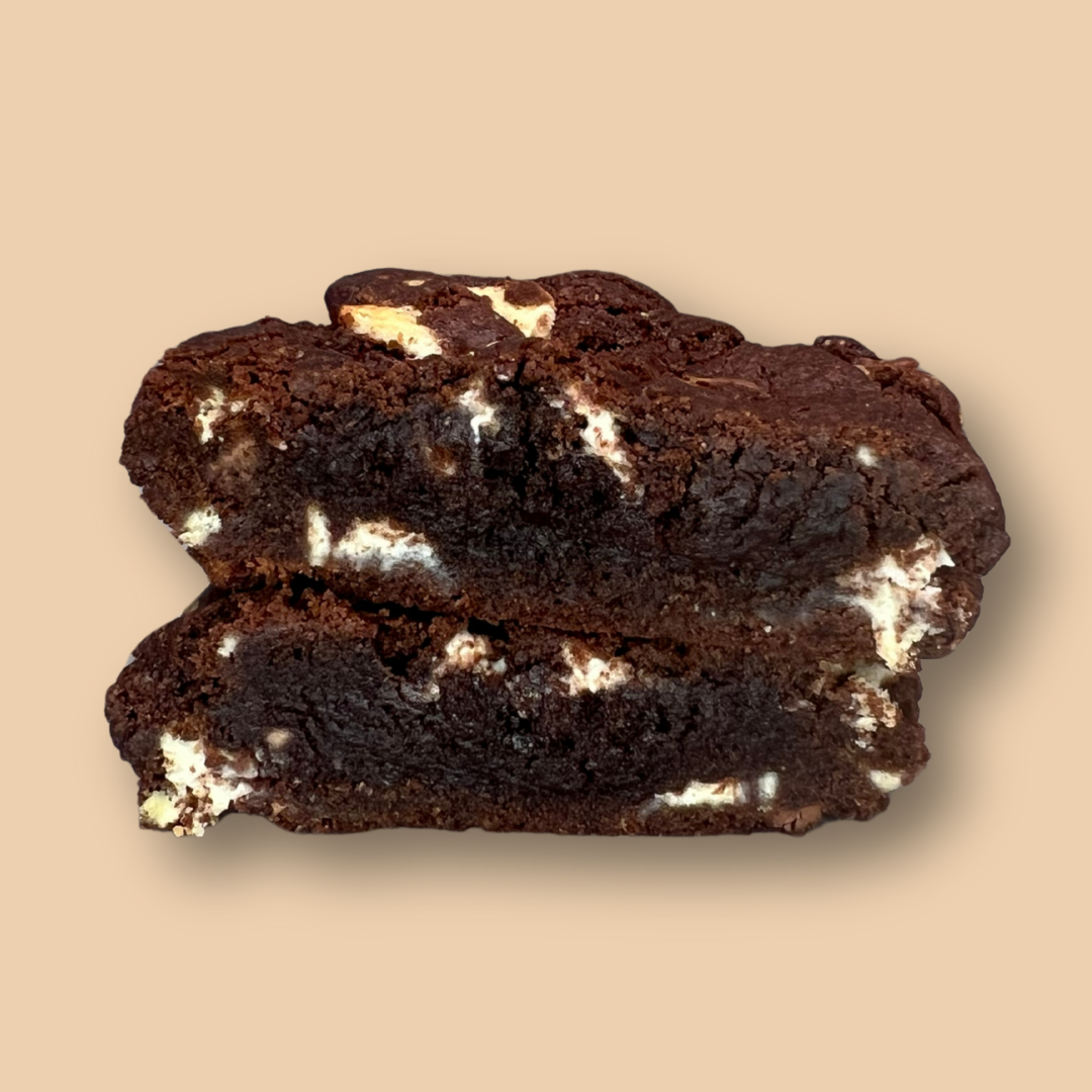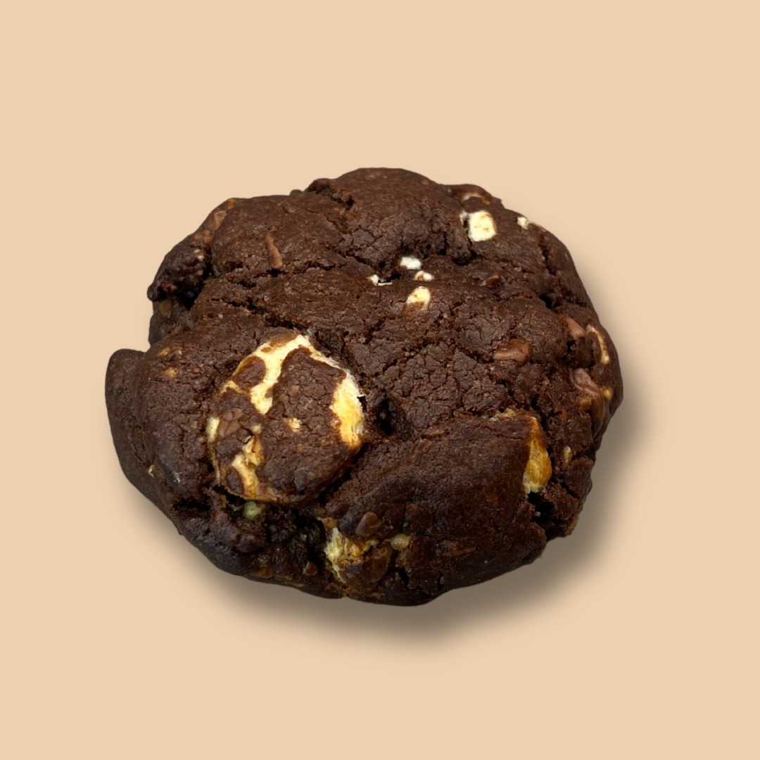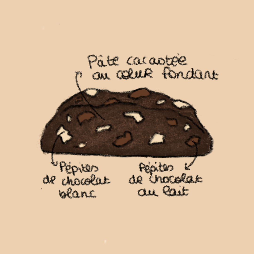 Un cookie intensément chocolaté, au cœur d’une pâte cacaotée riche et fondante. Il dévoile un duo irrésistible de pépites de chocolat au lait et de chocolat blanc pour une explosion chocolatée à chaque bouchée.