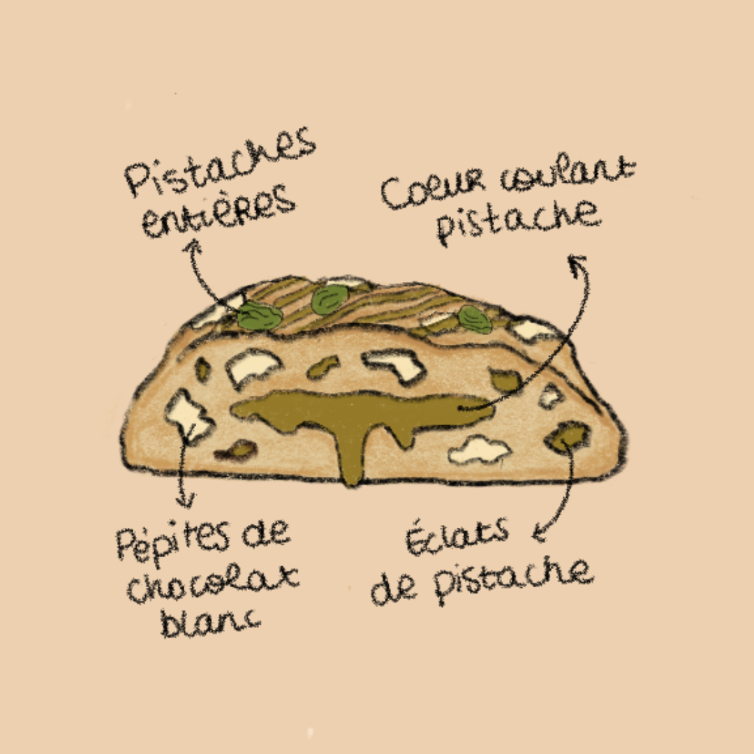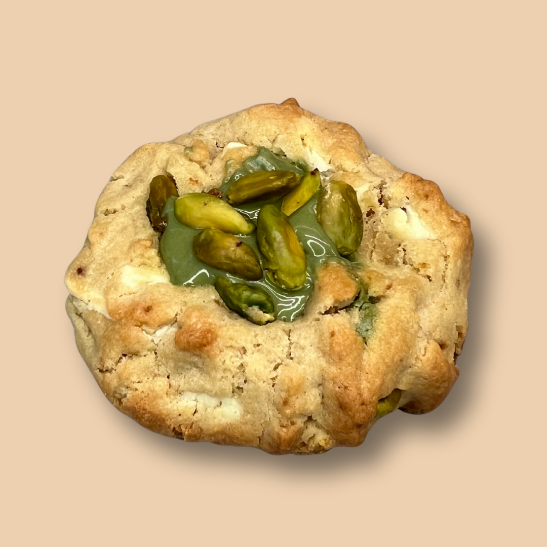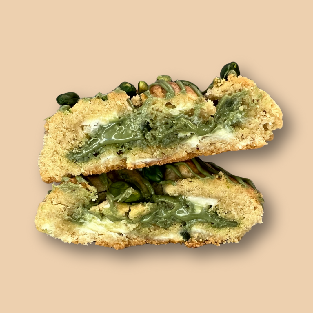 Une pâte moelleuse aux pépites de chocolat blanc, des éclats de pistache croquants, et un cœur onctueux à la crème de pistache. Doux, intense et terriblement raffiné : l’amour en une bouchée 💚.